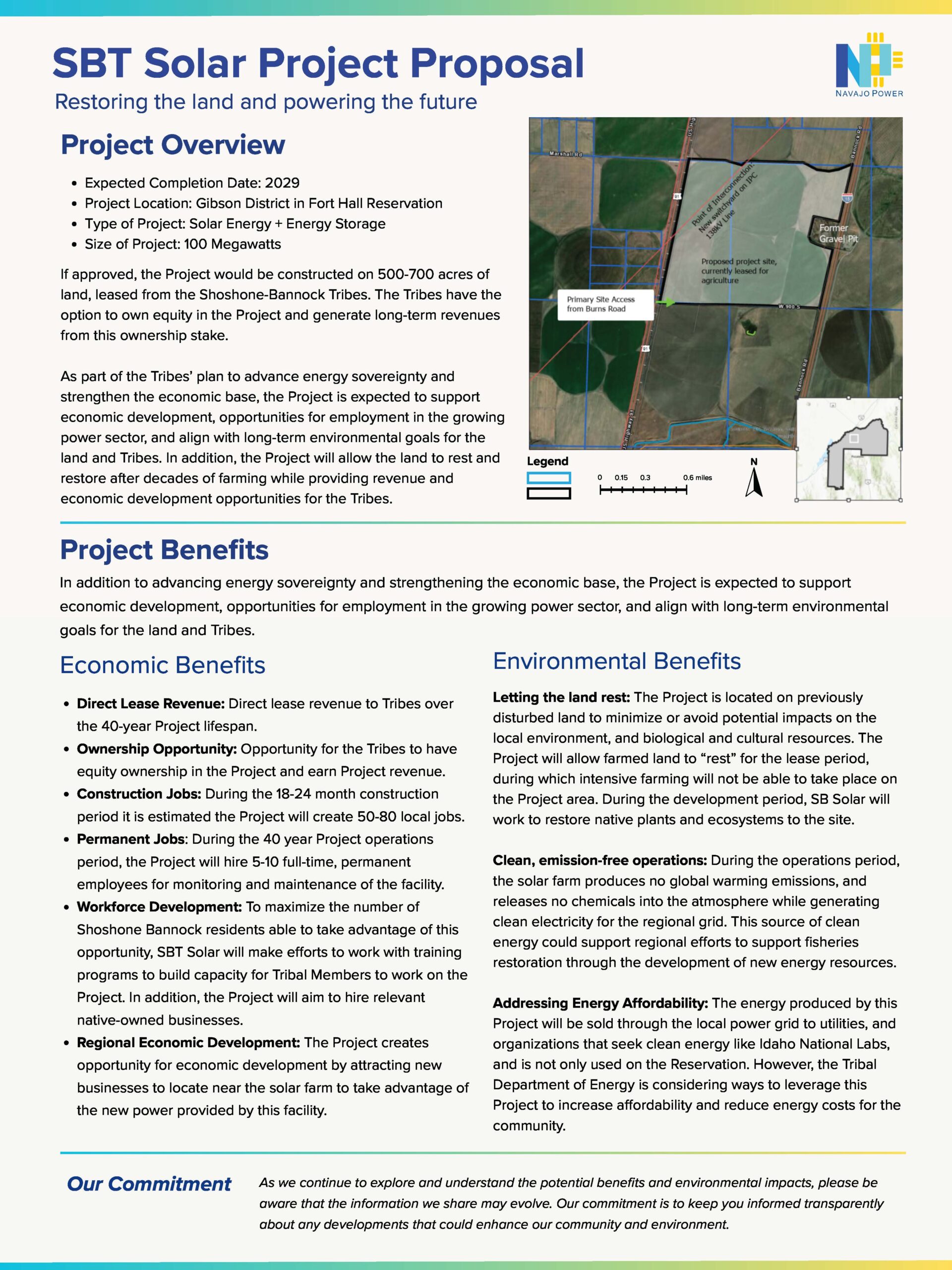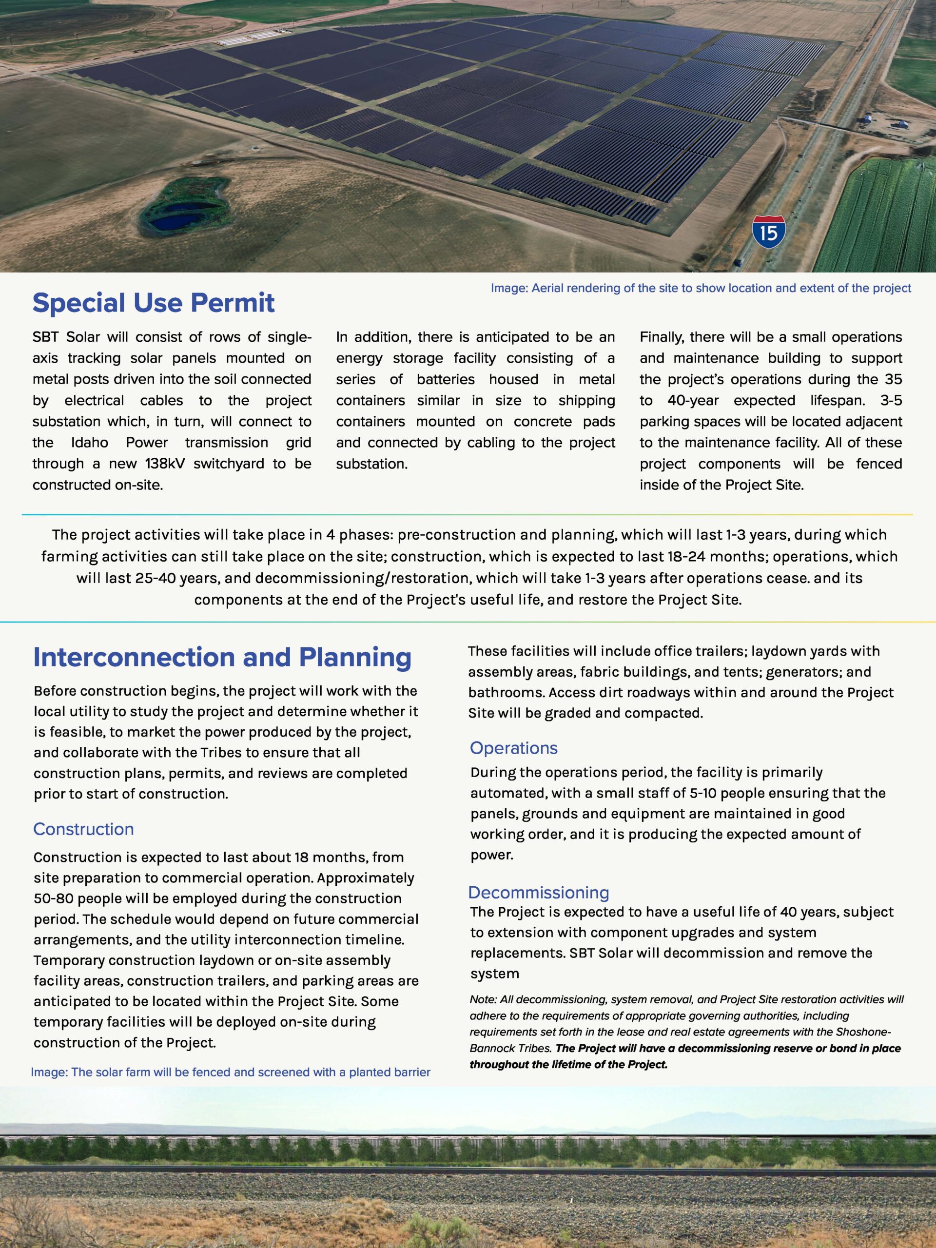 SBT Solar of Navajo Power is requesting a Special Use Permit approving the lease of approximately 704 acres of previously disturbed land from the Shoshone-Bannock Tribes, between 1-15 and Hwy 9 1 for 40 years and to develop a 100 MW large-scale solar energy and storage facility.