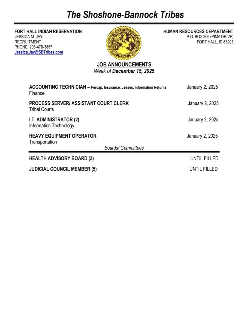 Shoshone-Bannock Tribes job announcement for the week of December 15, 2025. Request job descriptions from Jessica at the Tribes’ Human Resources Department.1-208-478-3857jessica.jay@sbtribes.com