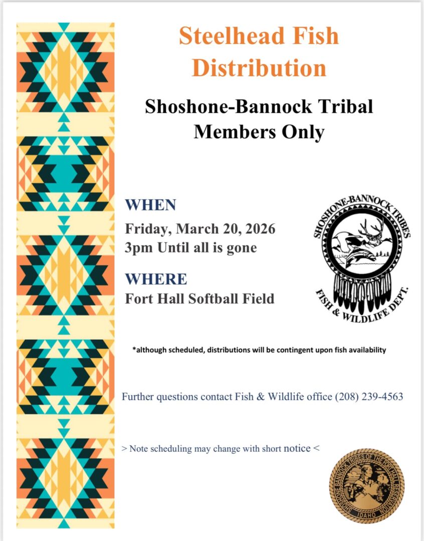 Steelhead Fish Distribution for Shoshone-Bannock Tribal members on Friday, March 20 at 3 p.m. at the Fort Hall Softball Field.